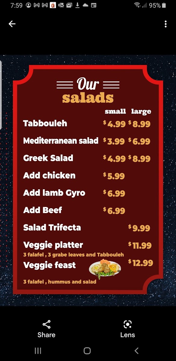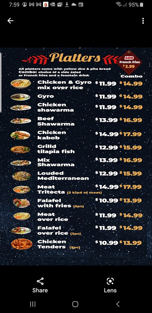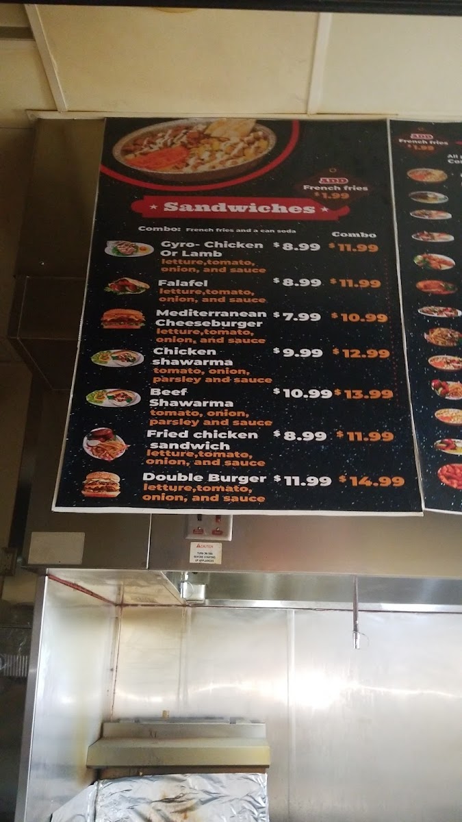 Choice of Lamb, Chicken or Beef over rice with pita bread and topped with sauce.
